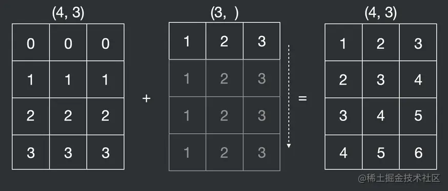 在上面的例子中,my_arr1.mean(0) 是一个 1 行 3 列的数组,当我们用一个 4 行 3 列的数组减去一个 1 行 3 列的数组时,便会对 1 行 3 列的数组进行广播。广播过程的图形化如下图所示:
