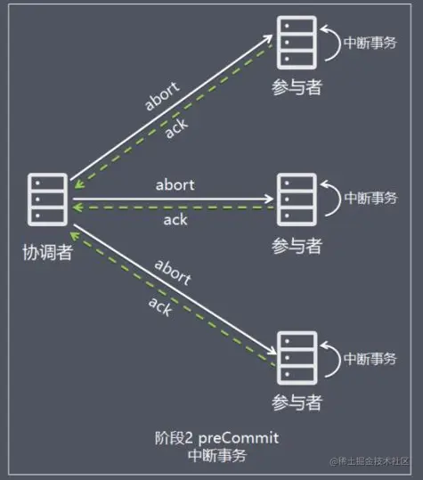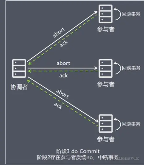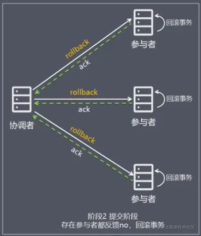 阶段 2 任何一个参与者反馈 no,或者等待超时后协调者尚无法收到所有参与者的反馈,即中断事务。