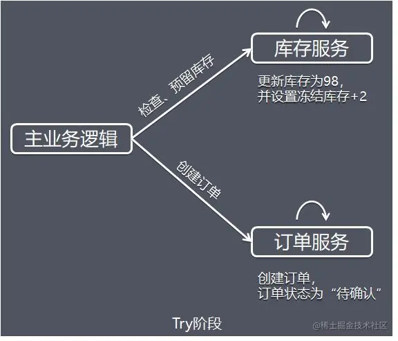 从执行阶段来看,与传统事务机制中业务逻辑相同。但从业务角度来看,却不一样。TCC 机制中的 Try 仅是一个初步操作,它和后续的确认一起才能真正构成一个完整的业务逻辑,这个阶段主要完成: