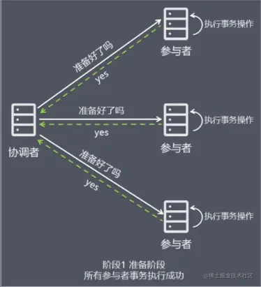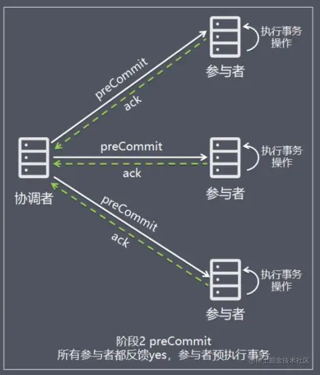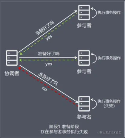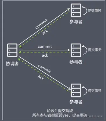 - 如果参与者执行成功,给协调者回复yes,表示可以进行事务提交。如果执行失败,给协调者回复no,表示不可提交。