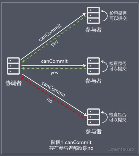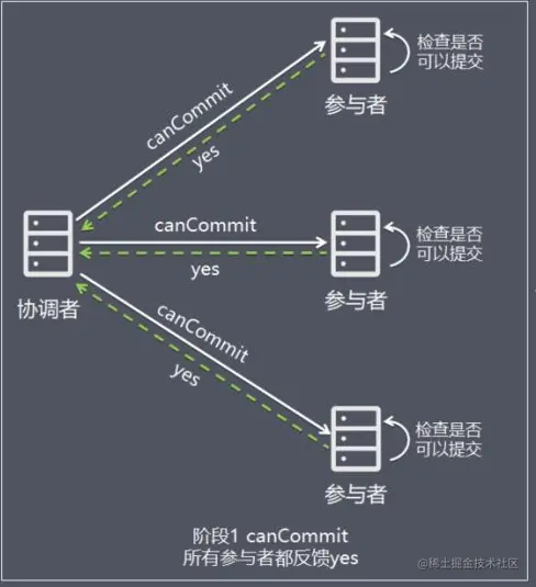 - 协调者向参与者发送commit请求,参与者如果可以提交就返回 yes 响应(参与者不执行事务操作),否则返回 no 响应: