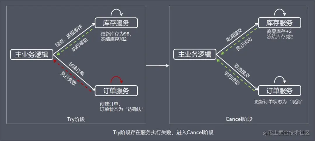 Cancel:当 Try 阶段存在服务执行失败, 进入 Cancel 阶段