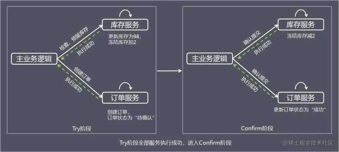 Confirm 阶段也可以看成是对 Try 阶段的一个补充,Try+Confirm 一起组成了一个完整的业务逻辑。
