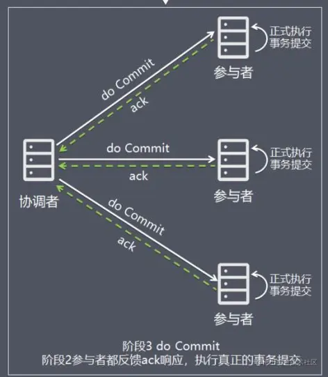 如果协调者收到了参与者的失败消息或者超时,直接给每个参与者发送回滚(rollback)消息;否则,发送提交(commit)消息。
