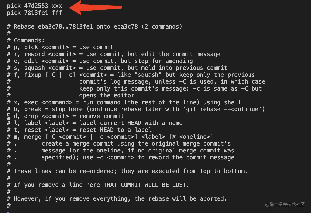git rebase -i commit_startId~commit_endId: 合并对应的提交记录之间的commit执行代码之后会看到一个这样的界面(不要慌):箭头指向的为你要合并的代码,下面的都是注释的提示,提示你怎么改