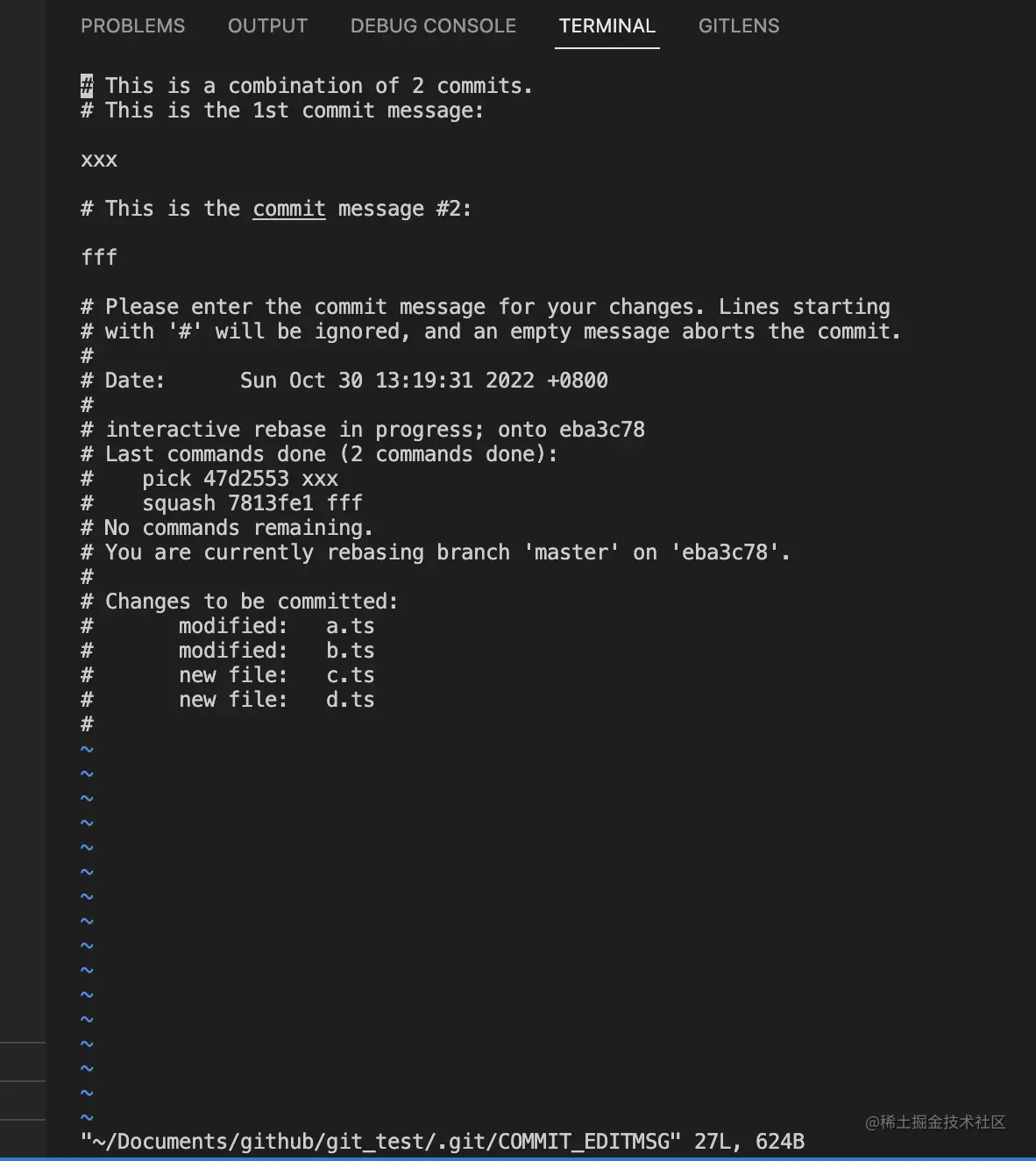 修改之后会出现新的文件提示: 这个时候是刚才我们合并了一个commit,这个时候可以进行修改commit的信息等,或者保持这样也行。