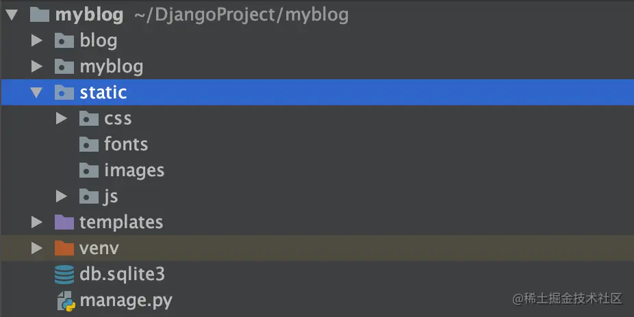 在项目的根目录中,除了之前文章中创建项目直接创建的 myblog 文件,自己建立的应用 blog 文件,模板文件 templates,我们需要再创建一个名为 static 的新文件夹,并可以在 static 文件夹创建 css、fonts、images、js 文件夹,如下图所示:
