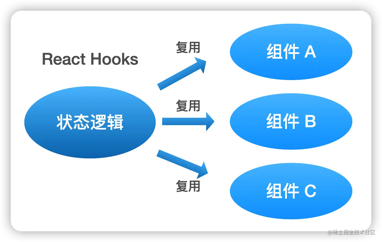 通过 React Hooks,我们可以把组件的状态逻辑抽离成自定义 hooks,相干的逻辑放在一个 Hook 里,不相干的拆分成不同的 hook,最终在组件需要时引入,从而实现状态逻辑在不同组件之间复用。