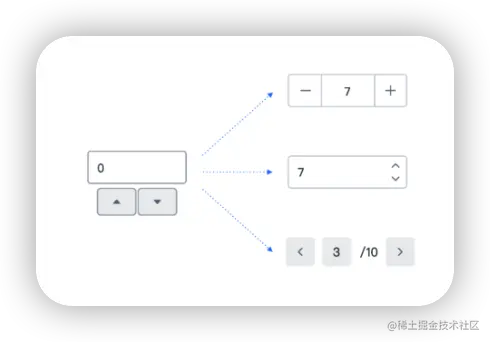 对于它的定制,可能体现在它 UI 视图层上的差异化。如下图,仅仅是 Counter 这种小组件,就有五花八门的 UI 形态,更别说其它更复杂的组件了。