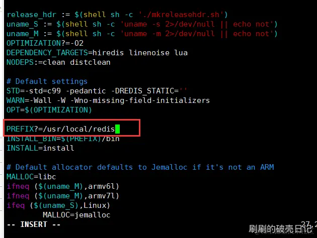 vim src/Makefile。 修改内容:PREFIX?=/usr/local/redis