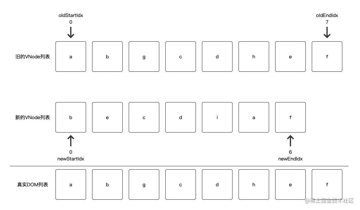 我们想让这个diff过程动起来,首先要找到动画的对象都有哪些,从函数的参数开始看,首先oldChildren和 newChildren两个VNode列表是必不可少的,可以通过两个水平的列表表示,然后是四个指针,这是双端diff算法的关键,我们通过四个箭头来表示,指向当前所比较的节点,然后就开启循环了,循环中新旧VNode列表其实基本上是没啥变化的,我们实际操作的是VNode对应的真实DOM元素,包括patch打补丁、移动、删除、新增等等操作,所以我们再来个水平的列表表示当前的真实DOM列表,最开始肯定是和旧的VNode列表是对应的,通过diff算法一步步会变成和新的VNode列表对应。