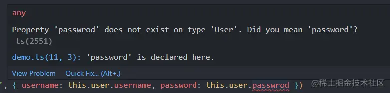 就在我写这篇文章做代码演示的时候,又发生了拼写错误,如下图。由于使用 ts 类型与 eslint,所以在开发时的问题我就能立马发现,而不是到了运行时才提示错误。