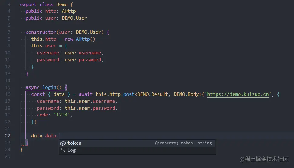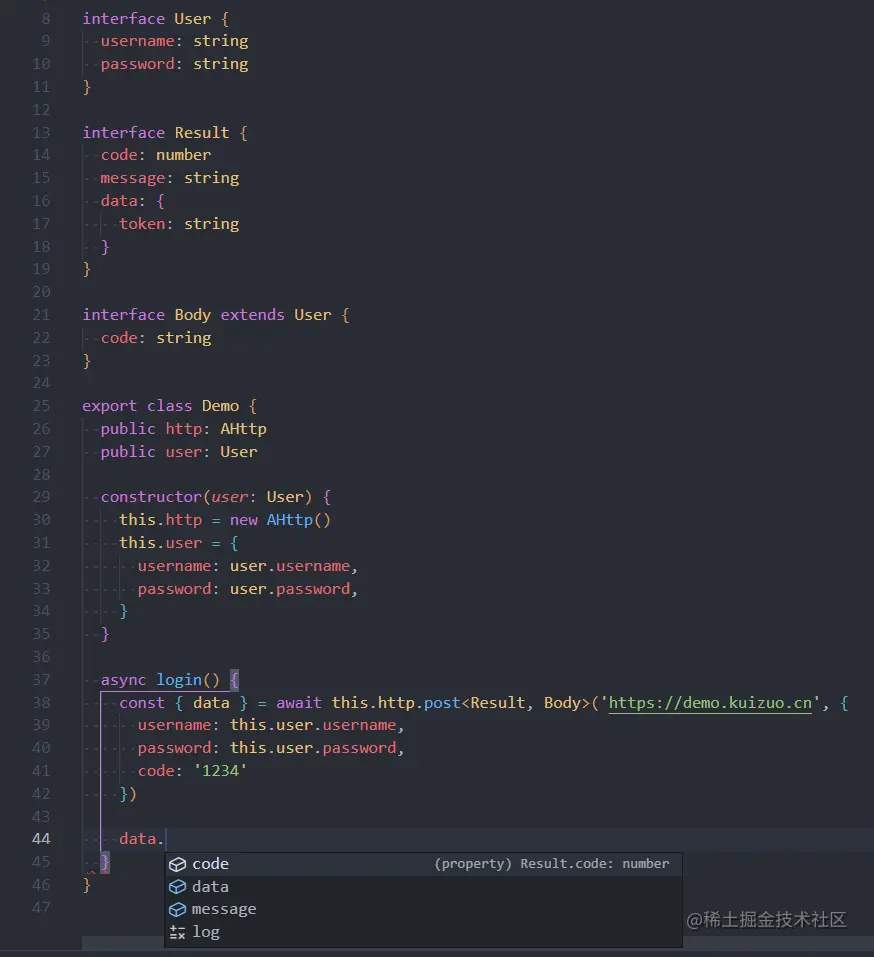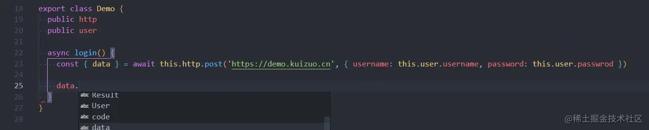 这是一个 post 请求用于实现登录的,但是这个响应数据 data 没有任何具体提示(这里的提示是 vscode 记录用户常输入的提示),这时候如果一旦拼接错误,就会导致某个数据没拿到,从而诱发 bug。同理提交的请求体 body 不做约束,万一这个请求还有验证码 code 参数,但是我没写上,那请求就会失败,这是就需要通过调试输出,甚至需要抓包比对原始数据包才能得知。