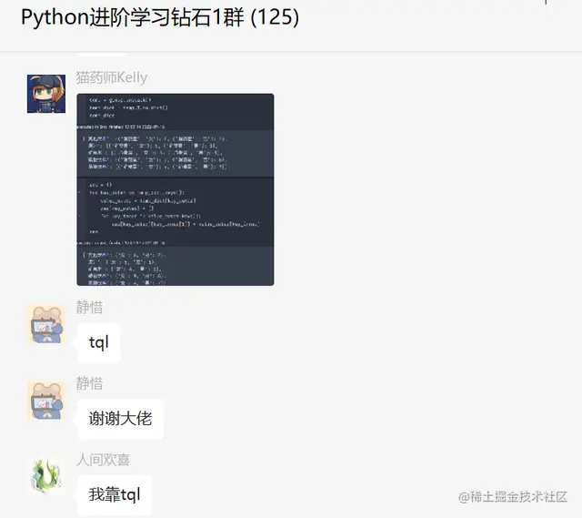 最后感谢粉丝【静惜】提问,感谢【心田有垢生荒草】、【猫药师Kelly】、【人间欢喜】给出的思路和代码解析,感谢【dcpeng】等人参与学习交流。
