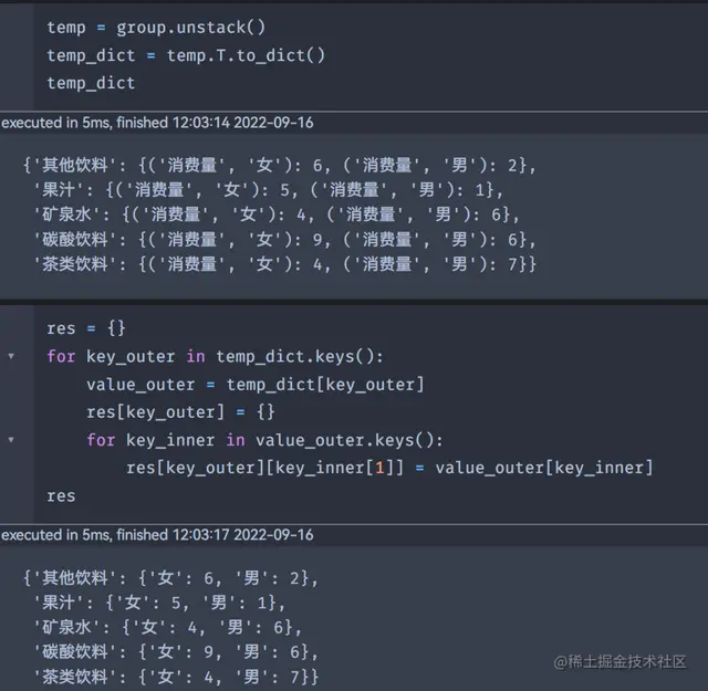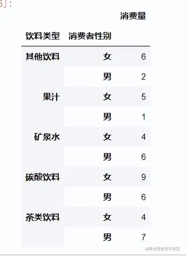 df1 = df.groupby(['饮料类型','消费者性别'])['消费者性别'].count().rename('消费量').reset_index()