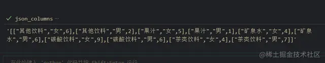 json_columns = df1.to_json(orient = "values",force_ascii=False)