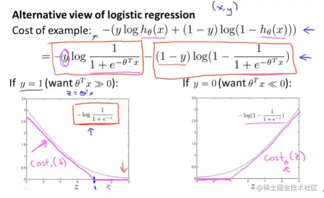 优化逻辑回归的代价函数,y=1和y=0时分别对应左右两边的图像,将log表达式的平滑曲线改为紫红的折线形式,然后开始构建支持向量机
