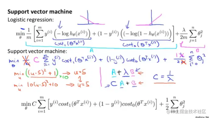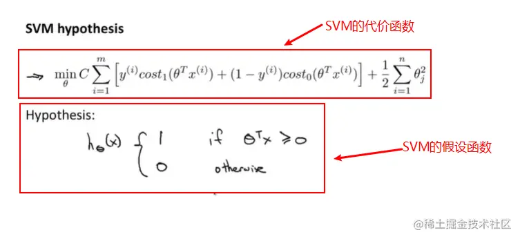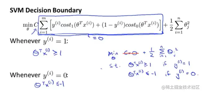 对代价函数进行改写,得到支持向量机的代价函数。1/m是常数,并不影响minJ(θ),将公式后半部分的λ(一个极大量,后半部分权重高)去掉,前半部分乘上一个常量C(一个极小量,同样后半部分权重高)