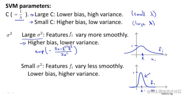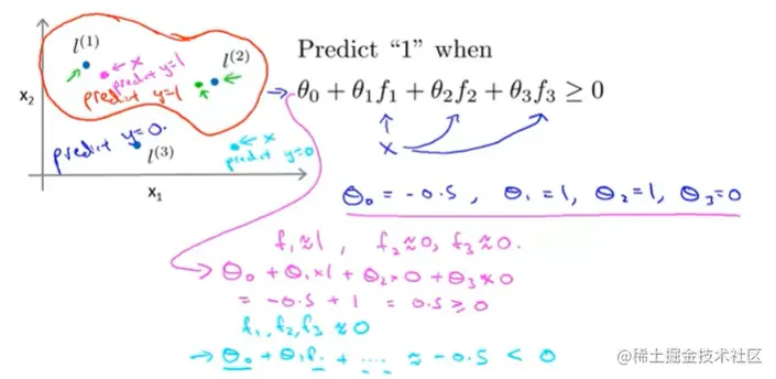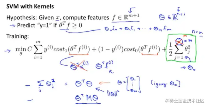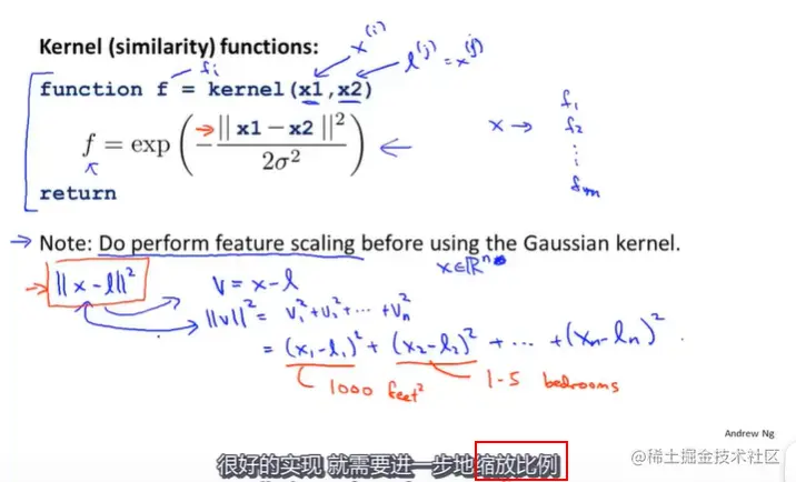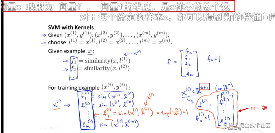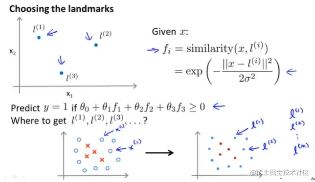 如上图所示,这里的x_i并不是一个样本里的第i个特征,而是指第i个样本。所以有m个样本,m个标记点,才会有m个f(f_1~f_m,f_0=1为截距),f_1表示X和样本点l1的相似度,f_2表示X和样本点l2的相似度