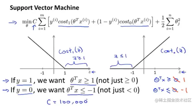 如果C非常大,那么希望有一个值可以使minJ(θ)的前半部分为0,如下图所示