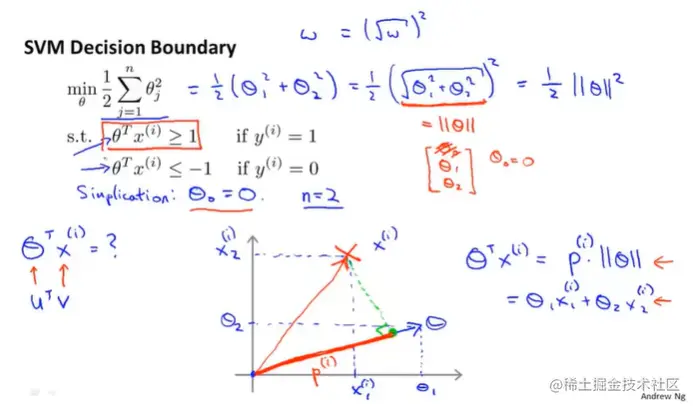 将minJ(θ)转化为向量内积的形式再进行计算,如下图所示