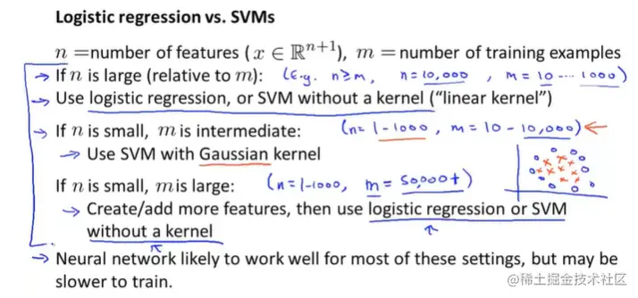 特征向量数量n很大,训练样本数量m很小,如果只想拟合一个线性决策边界,而不是复杂的非线性决策边界(因为没有足够的数据,很可能会出现过拟合现象)