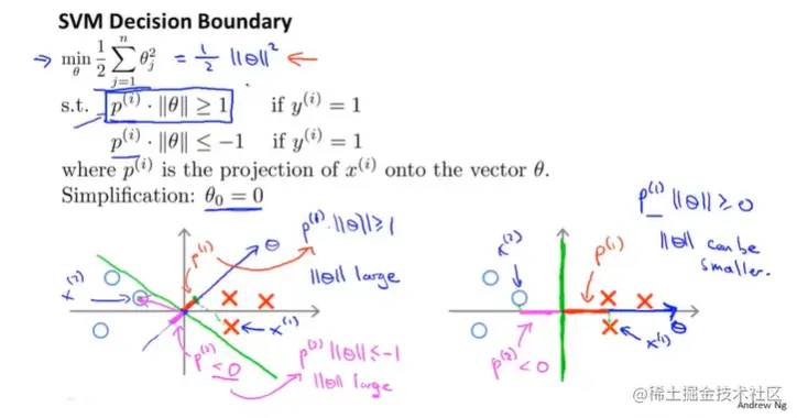 参数θ向量和决策边界垂直,θ_0=0表示参数θ向量过原点,左边的图绿色线是一个决策边界,通过计算得到的p很小,要满足条件p_i·||θ||>=1,则需要||θ||的值很大,即θ的范数很大(这里和向量的模很类似)。但是支持向量机需要一个范数较小的参数θ向量,即向右边这样的(p的值比较大,则||θ||的值较小),这样即得到一个比较合适的决策边界,间隔较大,健壮性高