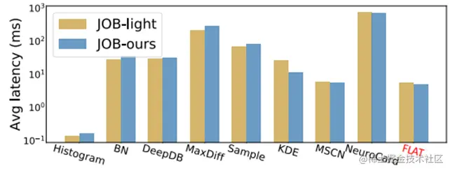 下方的图表展示了不同方法的平均延迟时间,为了公平起见,这里仅比较了基于 CPU 的方法。排名依次为:Histogram ≈ FLAT > MSCN > SPN-Multi/DeepDB > KDE/Sample >> 其它。