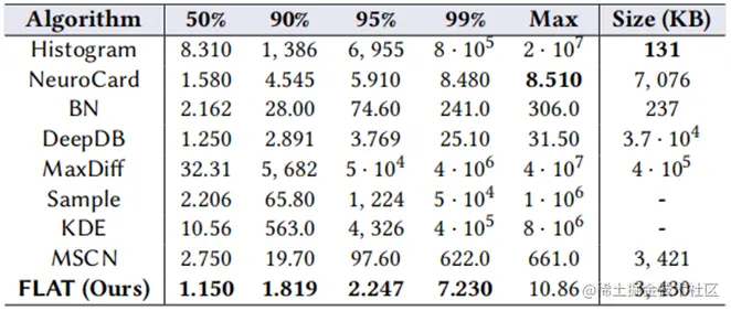 FLAT 的性能远超 Histogram,MaxDiff 和 KDE:Histogram 和 MaxDiff 仅做了粗粒度的独立性假设;KDE 则无法有效地用核方法处理高维度数据 ( high-dimensional data )。
