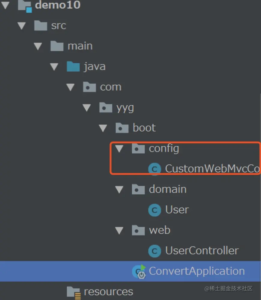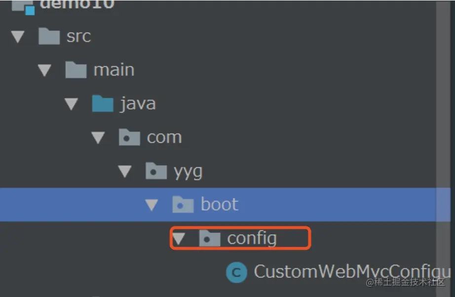 接下来我们在项目包中创建config包,并创建一个CustomWebMvcConfigurer类,代码结构如下图所示: