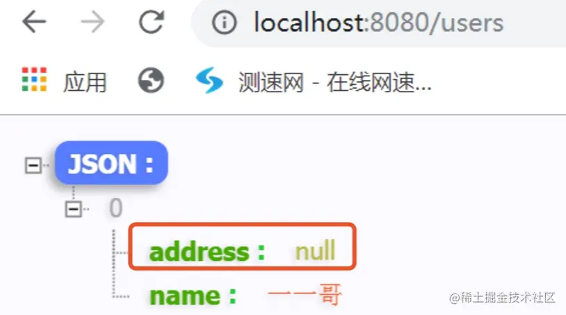 然后重新启动项目并访问,从结果可以看出,我们配置的消息转换器起了作用,null值展示了出来。
