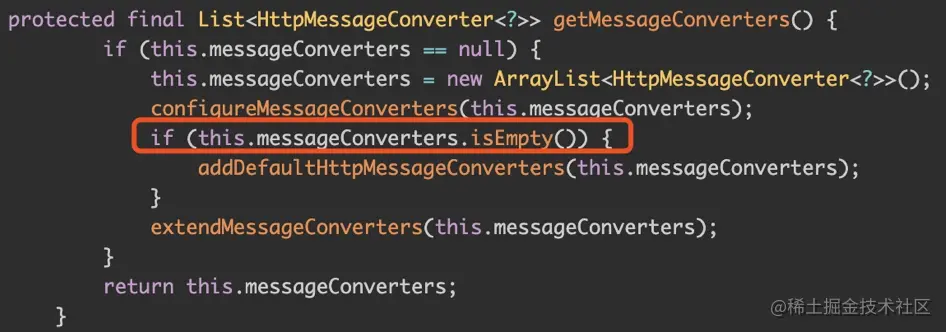 而如果我们没有配置自己的 MessageConverter,SpringMVC启动时就会调用 addDefaultHttpMessageConverters()方法。