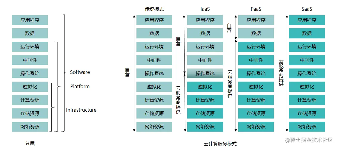 - 平台即服务PAAS:不仅仅提供基础设施,还包括了中间运行环境;
