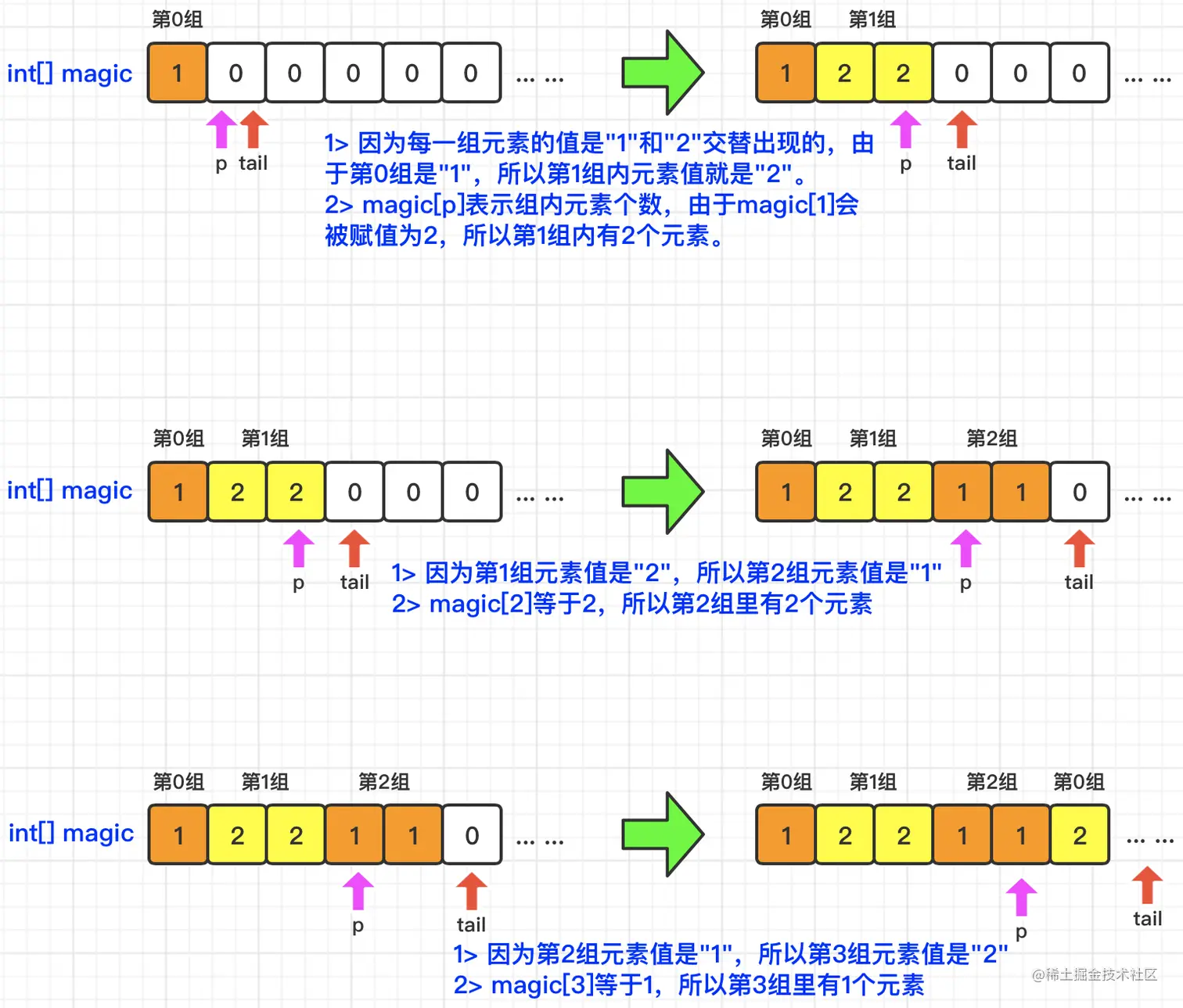 根据题目描述,我们可以采用双指针的方式来模拟创建这个“神奇字符串”。其中,**p指针每次移动都是+1的,magic[p]表示第p组里有多少个元素。tail指针指向的是待赋值的元素位置。**那么,我们先向magic数组中初始化magic[0]=1,表示第0组有1个元素,值为1。那么,由于每个组内的元素值是“1”和“2”交替出现的,那么就可以推断出下面每个组元素个数,以及元素的值了。具体请见下图所示:
