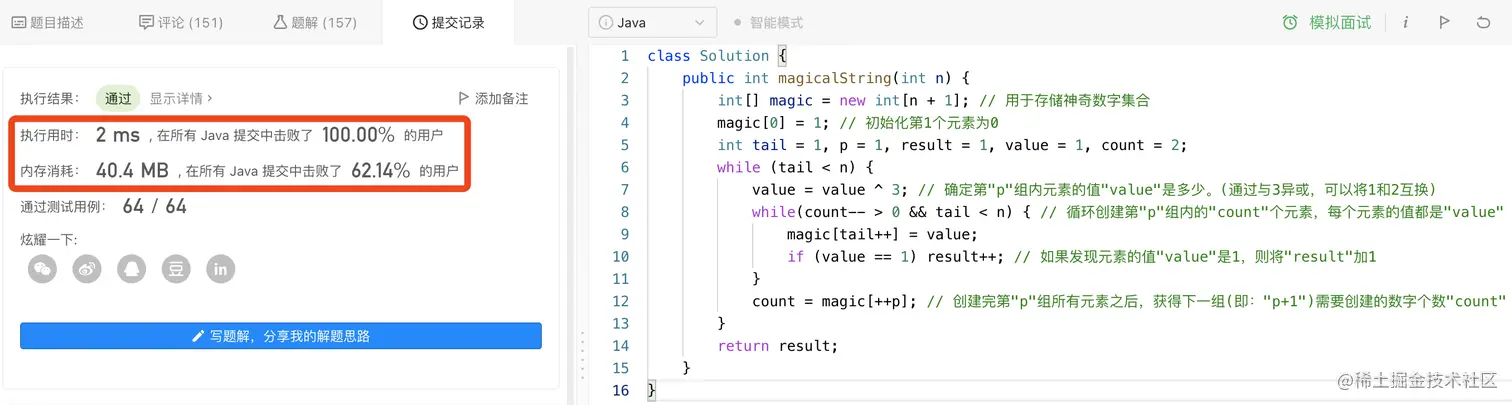 【解释】神奇字符串 s 的前 6 个元素是 “122112”,它包含三个 1,因此返回 3 。