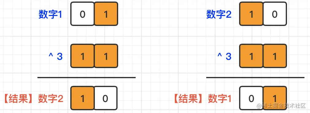 当我们了解到了异或的按位翻转功能,就可以通过采用与3进行异或方式将数字1和2相互转换。