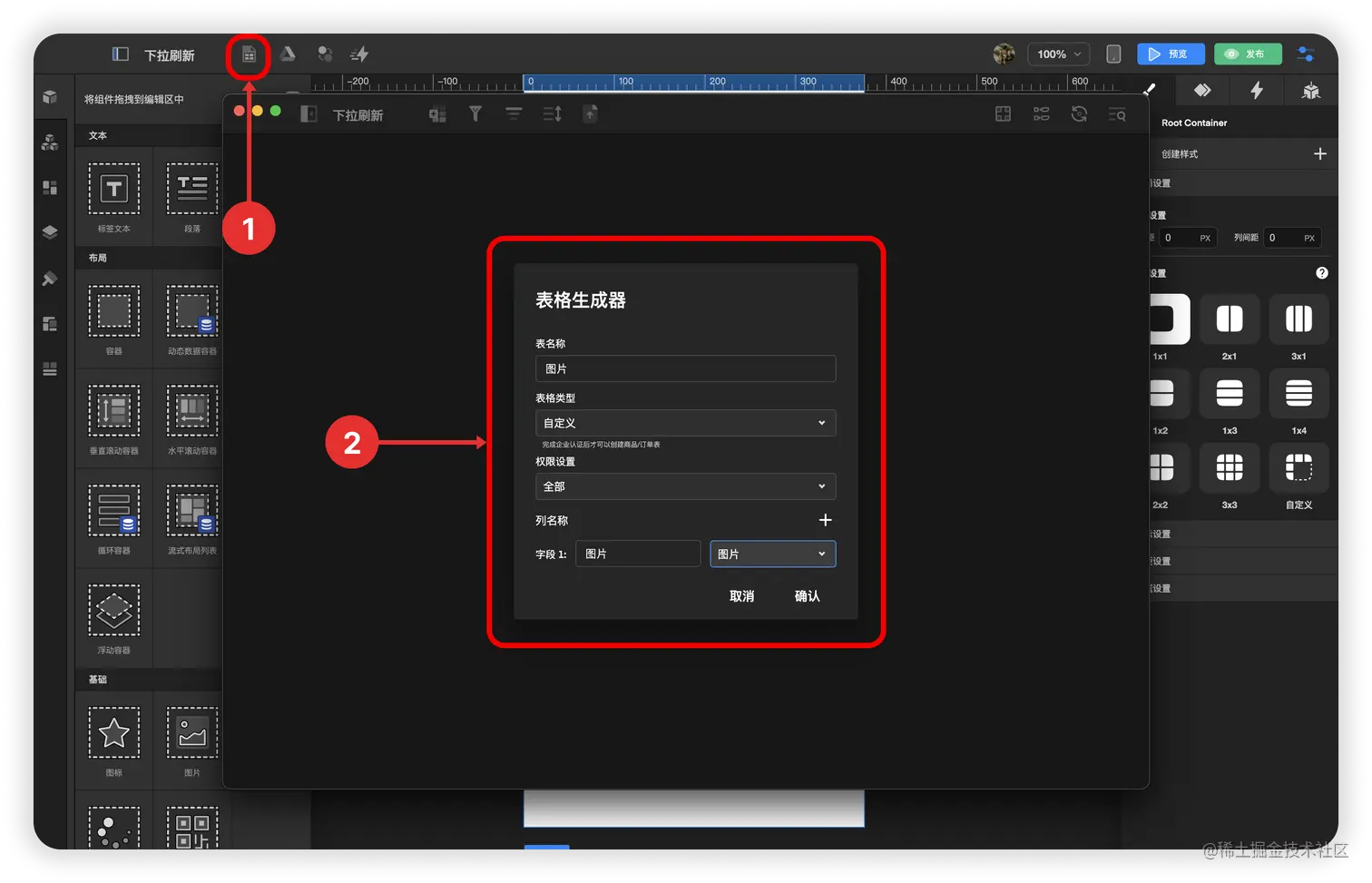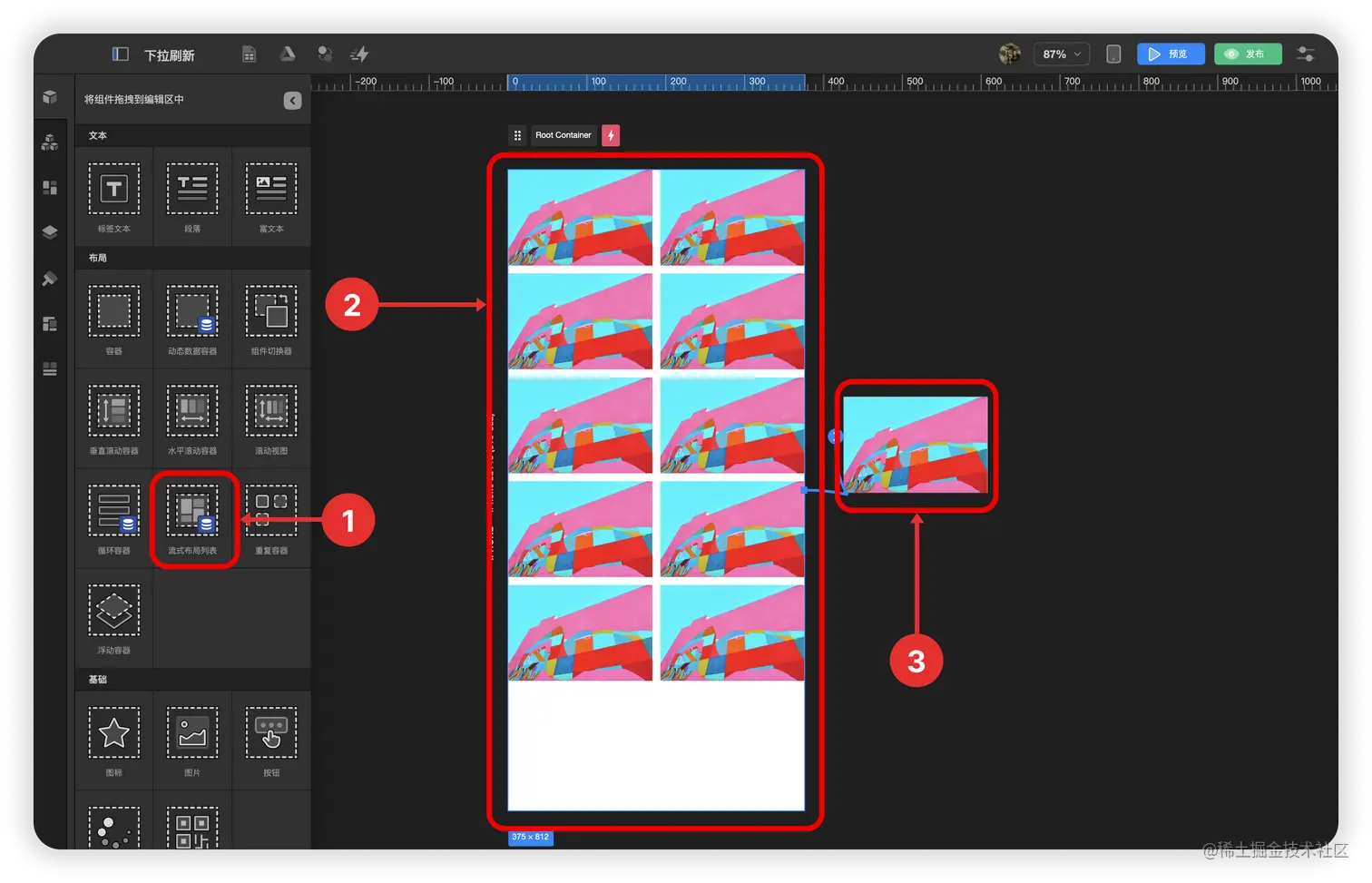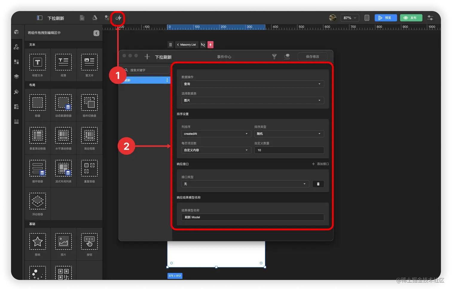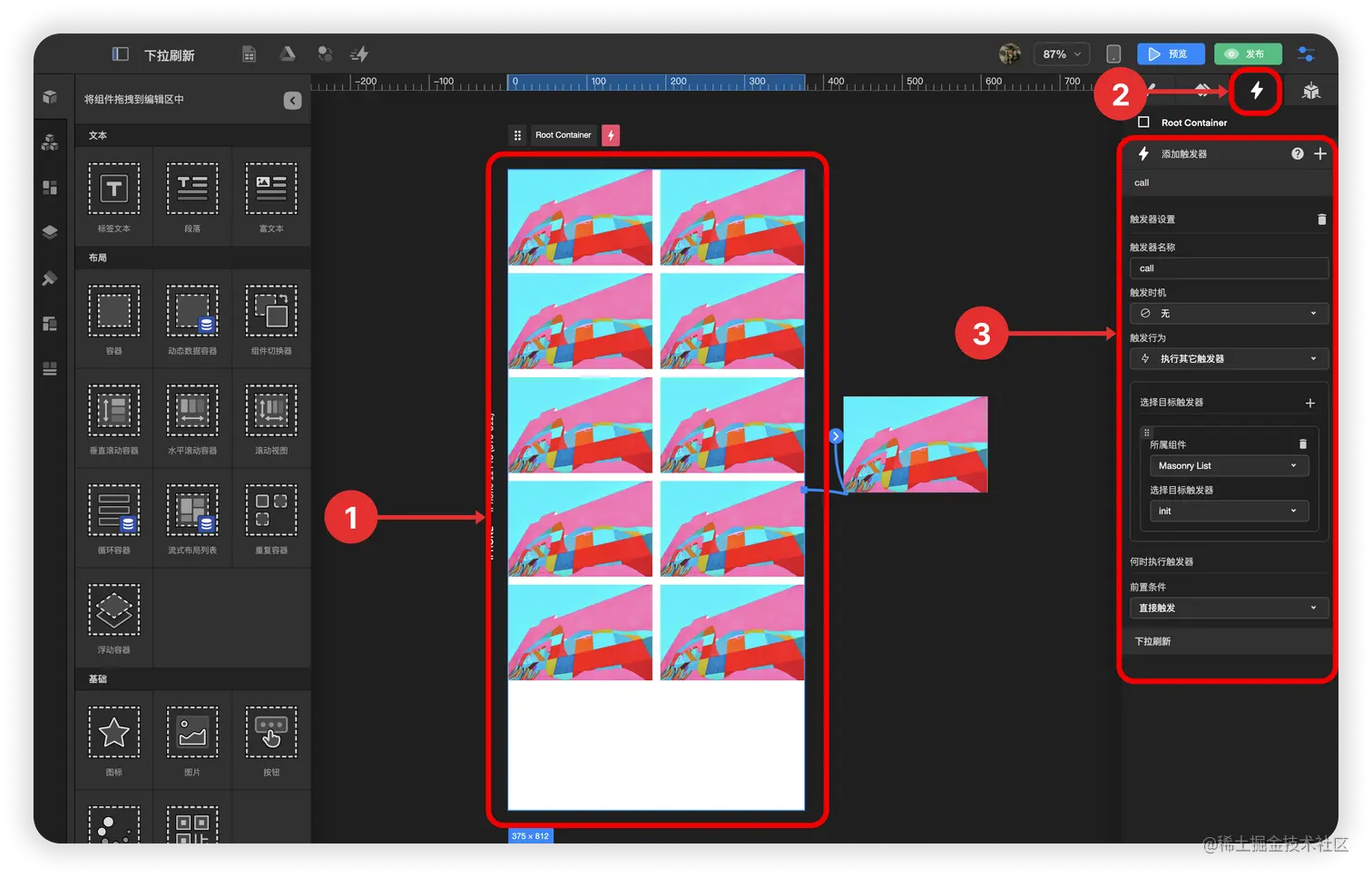 如何制作下拉刷新图片列表 TOWIFY 2022-10-31 144 阅读1分钟 效果展示 具体步骤 创建数据表 制作图片列表 创建图片查询事件 创建图片查询触发器 步骤分解 创建数据表 点击 数据中心 创建数据表 制作图片列表 拖拽 流式布局列表 到 根容器 拖拽 图片 到 条目中 创建图片查询事件 点击 事件中心 创建事件 创建图片查询触发器 选中 流式布局列表 点击 检查面板 中的 触发器 创建触发器 选中 根容器 点击 检查面板 中的 触发器 创建触发器