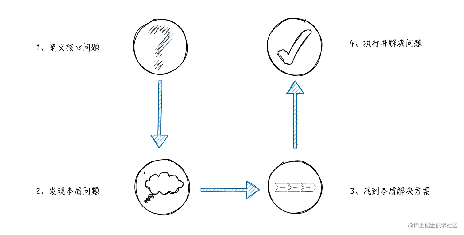 U 型思考法是一个找准问题和看透本质的思维模型。其核心就是从表象问题不断的深挖其本质,再基于本质问题,再找出解决方案。主要分为 4 个步骤: