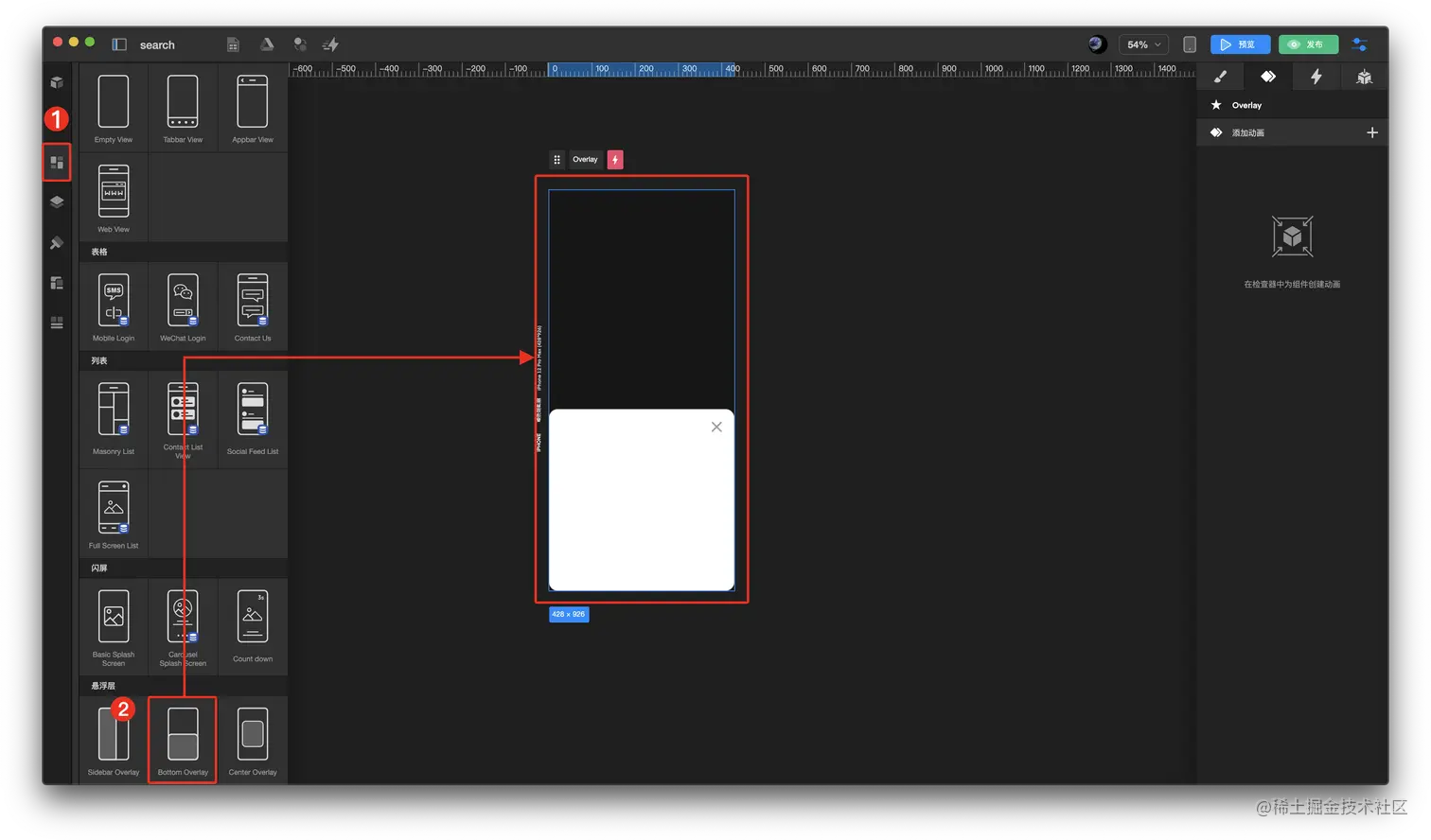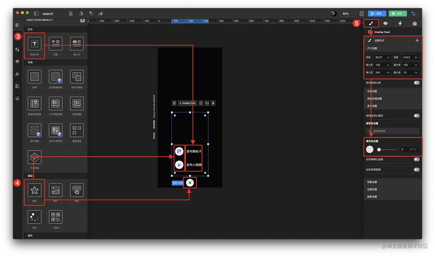 1.5在右上方面板 样式 中的 尺寸设置 填充色设置 配置需要的悬浮层样式