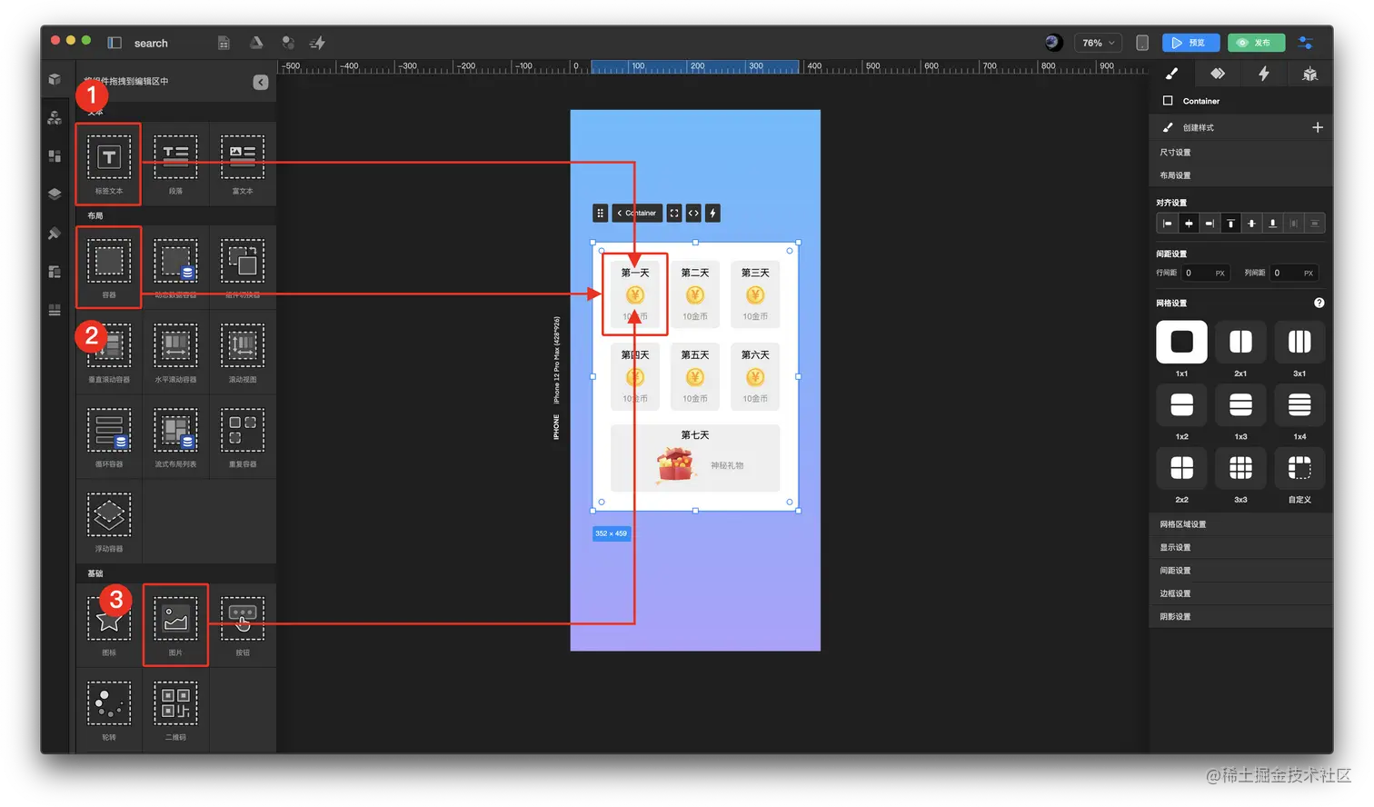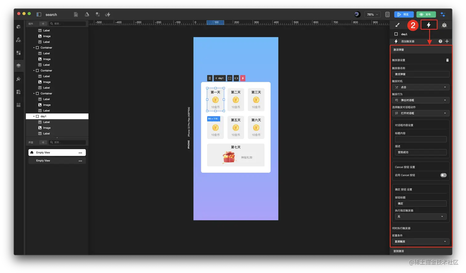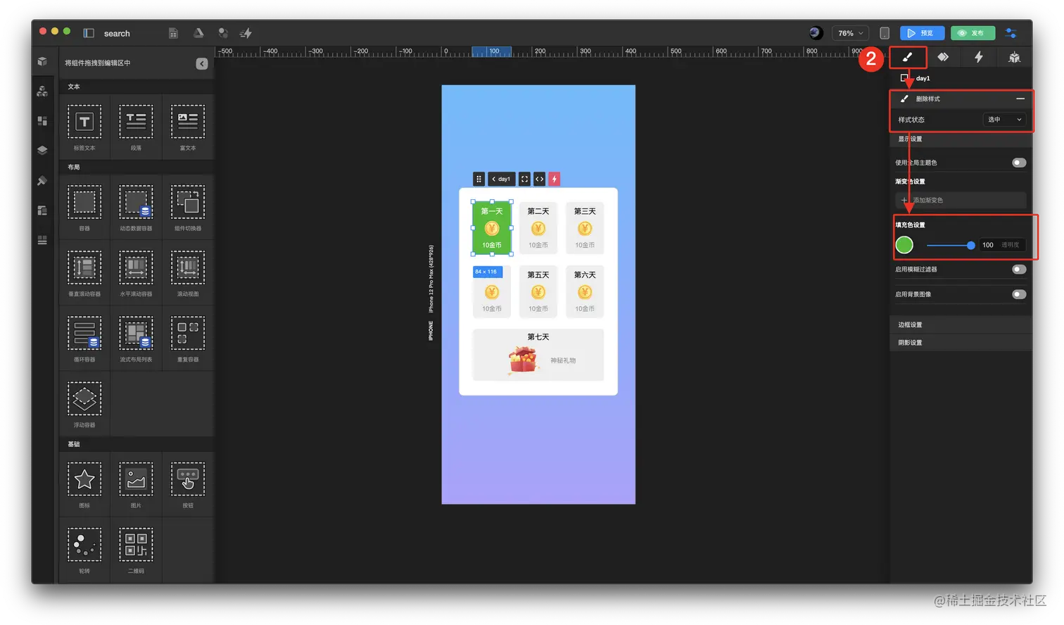 如何使用样式制作签到奖励页面? TOWIFY 2022-10-31 113 阅读1分钟 效果展示: 具体步骤: 添加需要的组件 配置默认选中样式 配置触发器 步骤分解: 添加需要的组件 添加 标签文本 添加 容器 添加 图片 配置默认选中样式 在右侧面板上方 样式 中选择 默认 样式 配置需要颜色 在右侧面板上方 样式 中切换 选中 样式 配置需要颜色 标签文本 配置方法相同 配置触发器 在右侧面板上方 触发器 中添加签到激活 触发器 并配置相关数据 在右侧面板上方 触发器 中添加激活弹窗 触发器 并配置相关数据 这样就可以使用样式制作签到奖励页面了。
