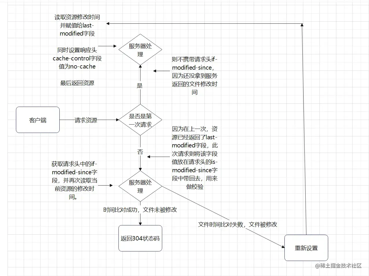 那么之后每次对该资源的请求,都会带上If-Modified-Since这个字段,而务端就需要拿到这个时间并再次读取该资源的修改时间,让他们两个做一个比对来决定是读取缓存还是返回新的资源。