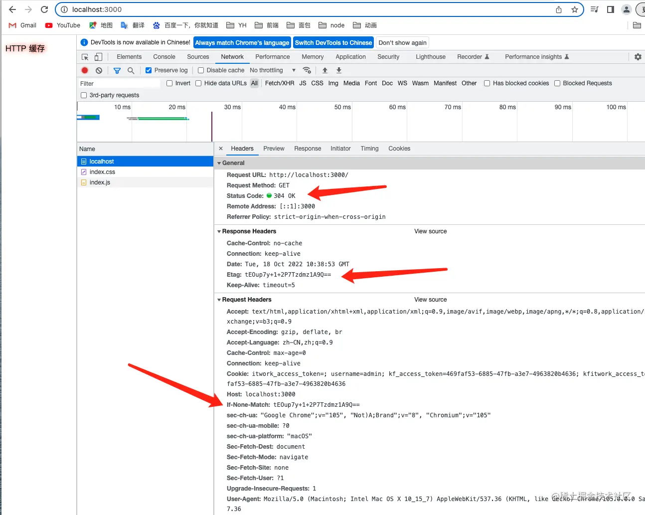 2.第二次请求某资源的时候,客户端自动从缓存中读取出上一次服务端返回的Etag 也就是文件指纹。并赋给请求头的if-None-Match字段,让上一次的文件指纹跟随请求一起回到服务端。