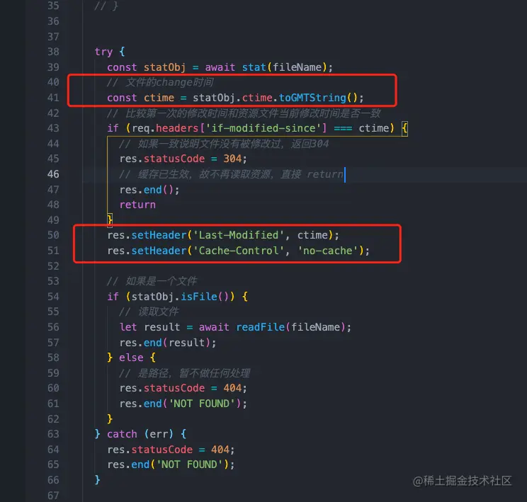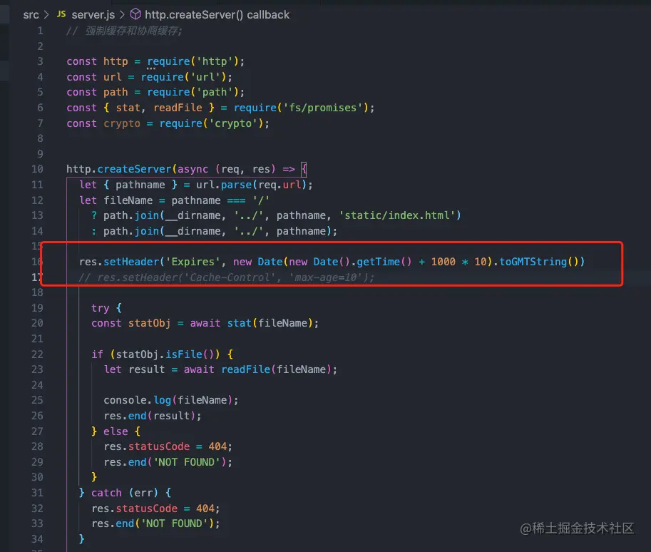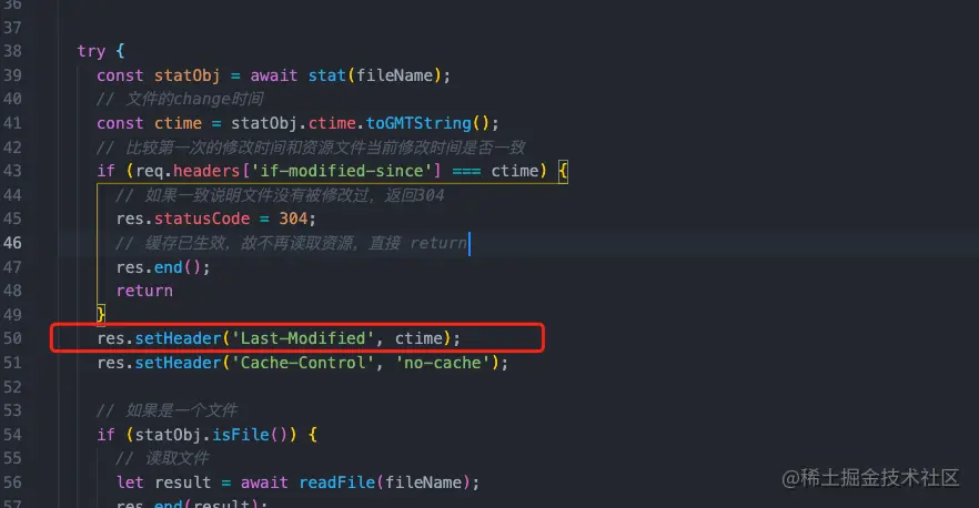 第三行,给该资源响应头的Cache-Control字段值设置为:no-cache.(上文有介绍,Cache-Control:no-cache的意思是跳过强缓存校验,直接进行协商缓存。)