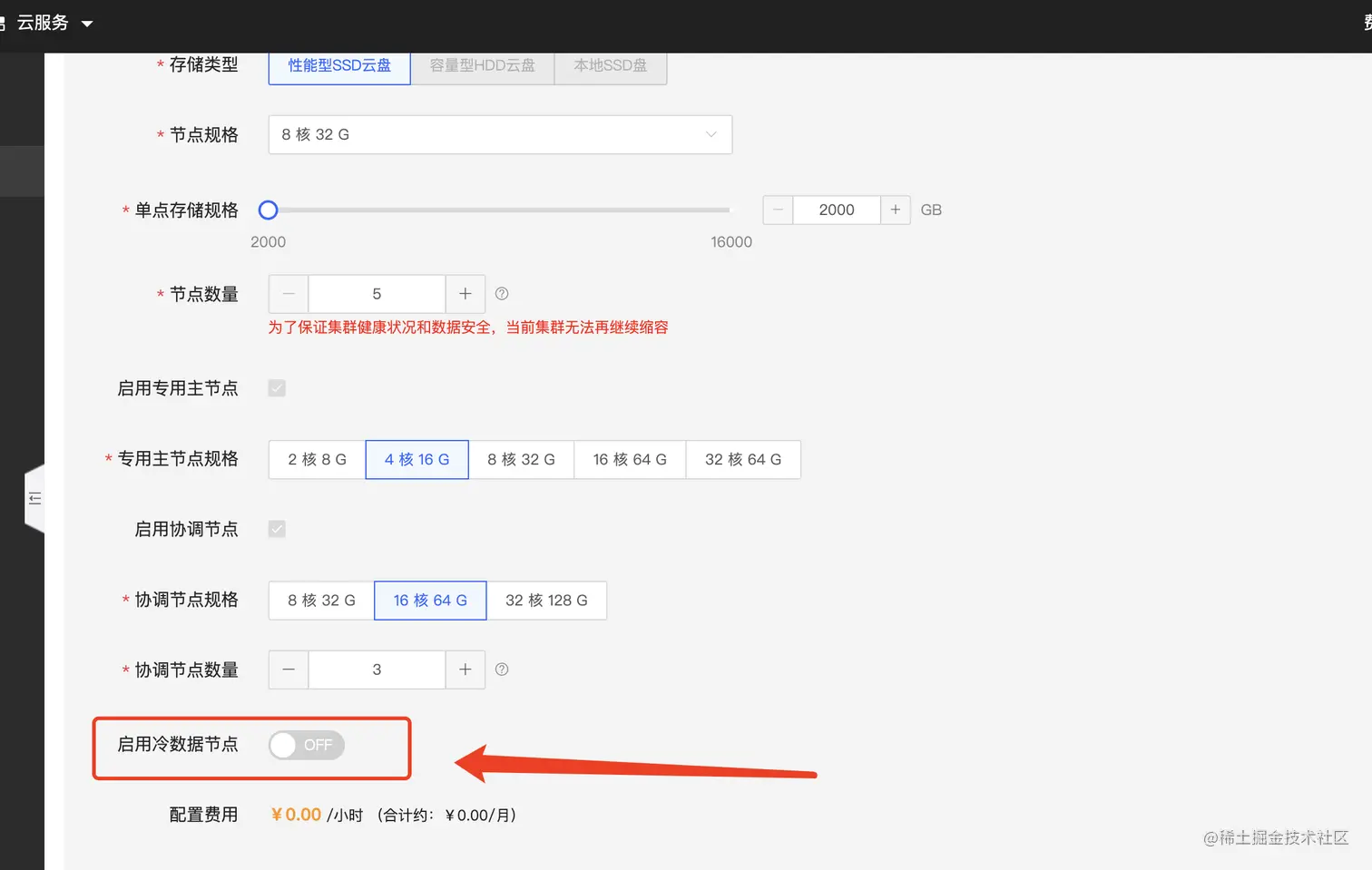 es冷热架构架构,该功能已经在京东云上线有一段时间了,欢迎大家根据自己的业务形态进行试用,冷数据节点开启如图2-1所示