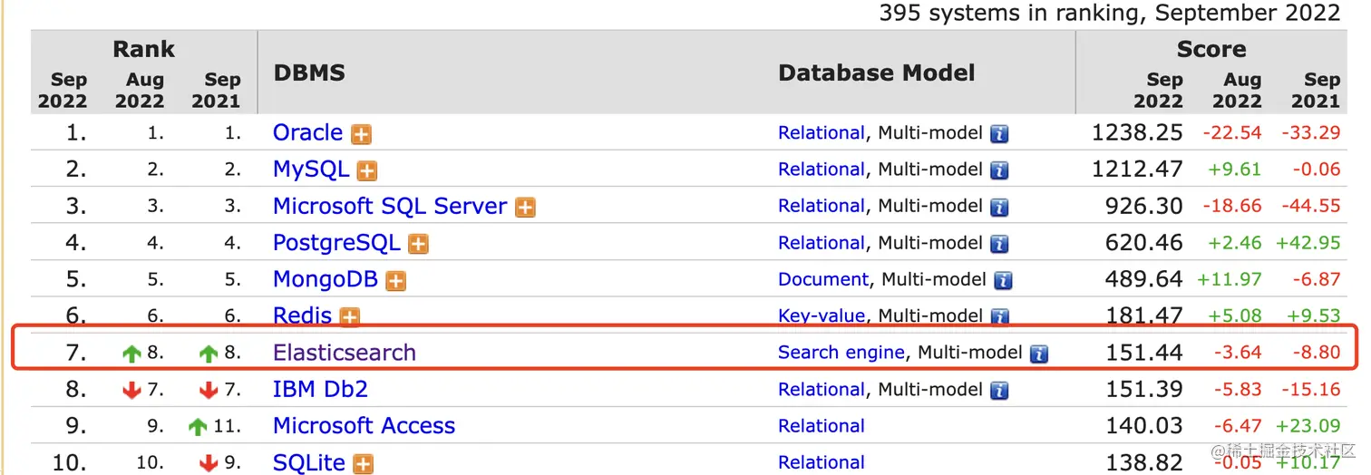 Elasticsearch在db_ranking 的排名又(双叒叕)上升了一位,如图1-1所示;由此可见es在存储领域已经蔚然成风且占有非常重要的地位。