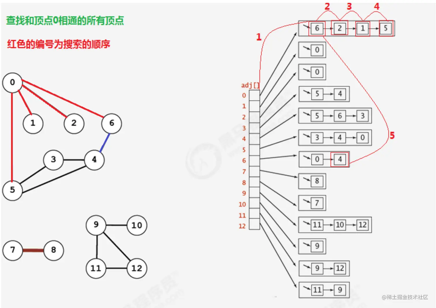 - 由于边是没有方向的,所以,如果4和5顶点相连,那么4会出现在5的相邻链表中,5也会出现在4的相