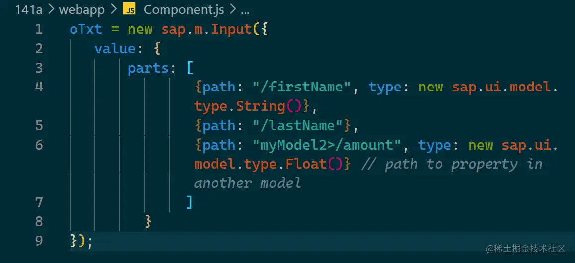 SAP UI5 应用界面上一个控件的数据源,可能来自模型的多个字段。
