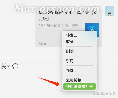 默认情况下,在 Mac 微信上收到一篇文章,如果想在浏览器中打开文章,得先在微信中打开文章,然后再点击右上角的浏览器图标才能在浏览器中打开。但装了 Tweak 后,就可以直接右键-使用浏览器打开。