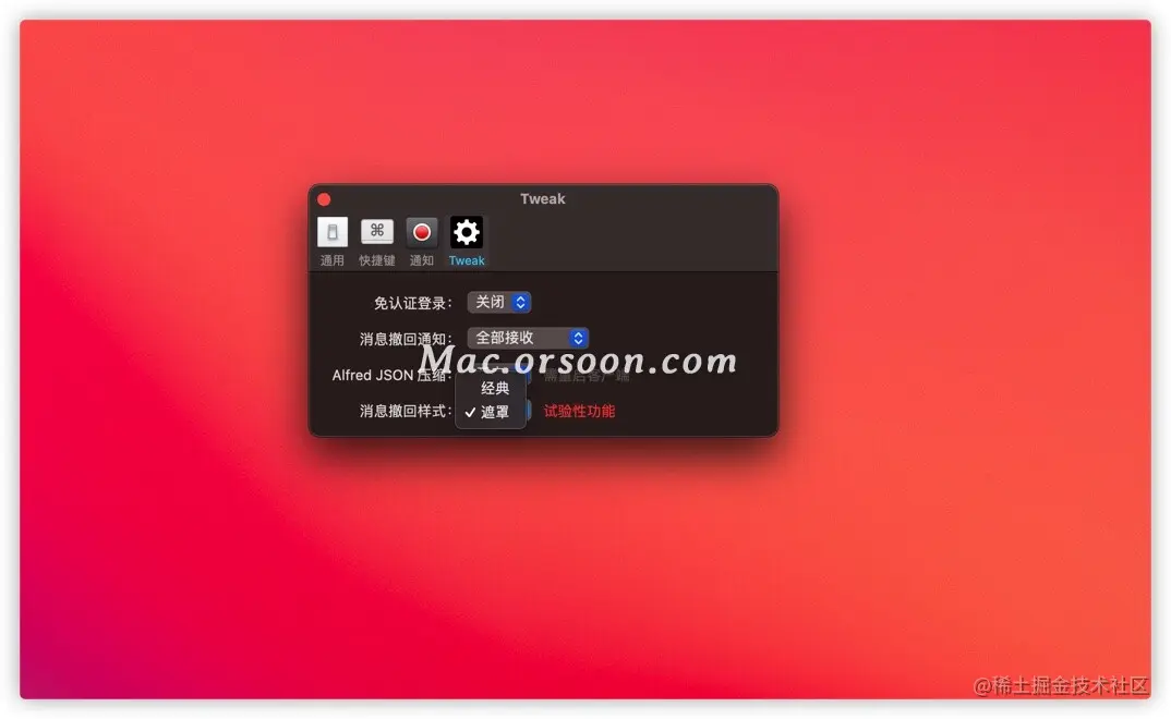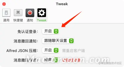 安装 Tweak 后,打开微信的设置,在 Tweak 的设置中,开启「免认证登录」,这样就只有在第一次登录 Mac 微信时,需要手机扫码验证登录,如果中间退出了微信,再登录时可直接登录,无需手机二次确认。