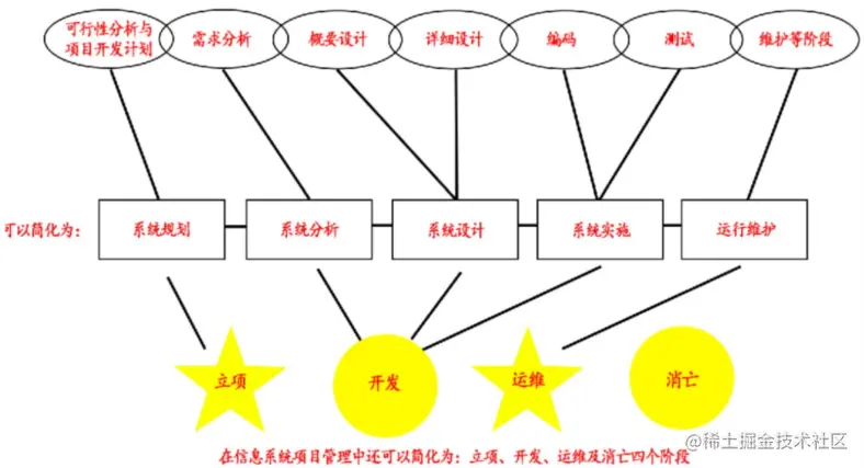 - 可行性分析与项目开发计划、需求分析、概要设计、详细设计、编码、测试、维护等阶段。